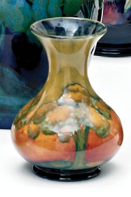the baluster body decorated with green trees on a mottled red and yellow ground, painted signature and impressed factory marks