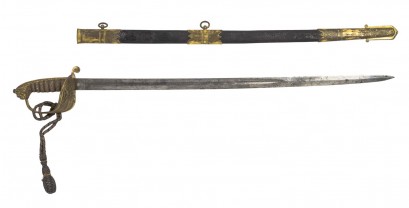 Lot Description:A Royal Navy dress sword with belt and buckle, Queen Victoria Crown