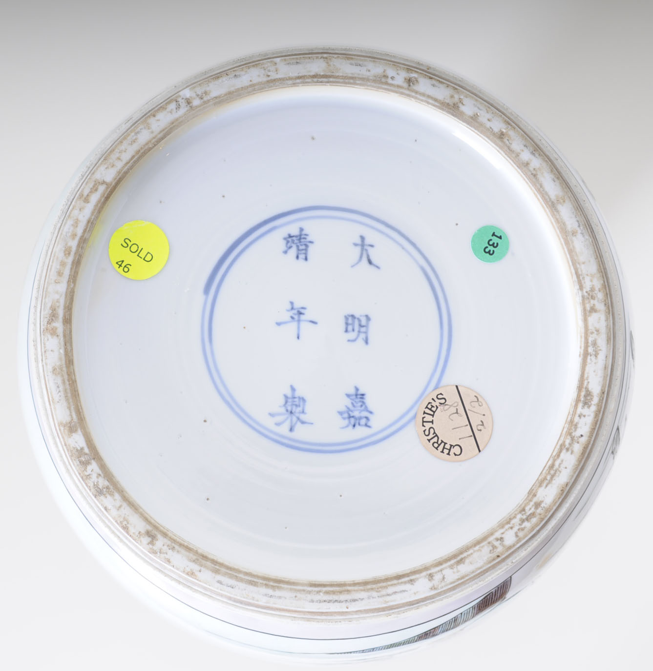 the cylindrical sides surmounted by a straight neck with galleried rim, the body painted in bright enamels with a maiden and two female attendants, one carrying a large dragon banner, riding in a carriage pushed by two footmen, and accompanied by other maidens on horseback carrying bows and arrows and swords, the party being greeted by horsemen wearing armour, in a continuous landscape of jagged rocks and trees, the angular shoulders encircled with bamboo vignettes and flowerheads reserved on a turquoise-green diaper band, and the neck with a continuous lakeside scene below a green key-fret border on the mouth, the base inscribed with an apocryphal six-character Jiajing mark in underglaze blue