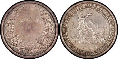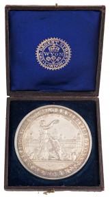 with NSW coat of arms surrounding symbols of art and industry, Garden Palace in background, obverse native fauna wreath surrounding 'SIR JOHN HAY, K.C.M.G./ VICE-PRESIDENT/ -of- / COMMISSION.', small relief 'J.B. & A.S. WYON' at base, in original casing, aFDC. -