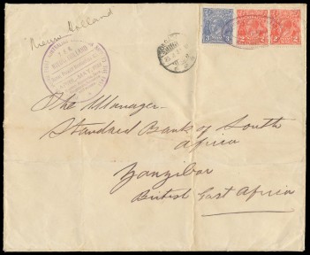 (217x178mm) to "Standard Bank of South Africa/Zanzibar/British East Africa" with Australian KGV 2d x2 & 3d tied by undated triple-oval '.../SS NIEUW HOLLAND/...' ship's cachet, largely very fine strike of the huge Trade Ship cachet in violet at left, 'SOERABAJA' & 'CORREIO/BEIRA' transits & 'ZANZIBAR' arrival backstamp, horizontal & vertical folds. -