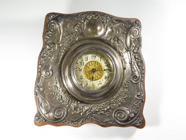 British United Clock Co., (Birmingham); oak backing; Crisford & Norris, Birmingham 1907. Ht 18cm. -