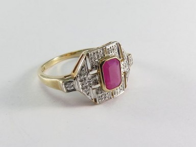 with a rectangular ruby with cut corners within a border of small diamonds; 9ct gold. Size P. -