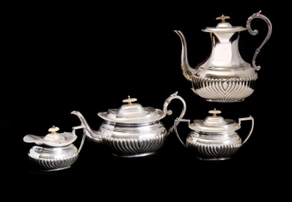 Incl. teapot, coffee pot, sugar bowl & cream jug. Reeded bases. Stamped EPBM. Some wear to plate on coffee pot.