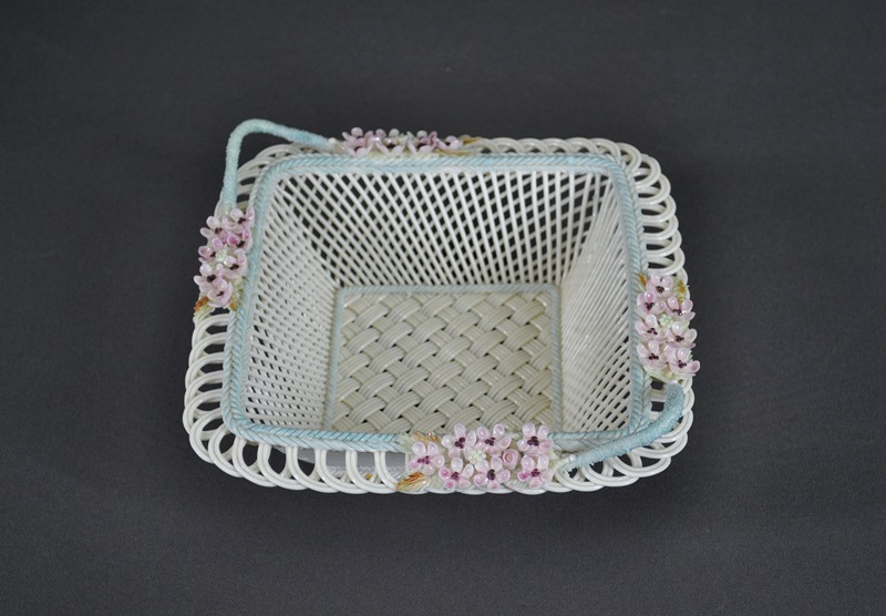Coloured floral encrustation & handles. 4 strand base. Ribbon mark.