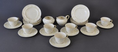 Shelll decoration with lemon highlights. 7 cups, saucers & plates, creamer & sugar bowl (& 2 additional plates). Green 6th mark. C.1970s. -