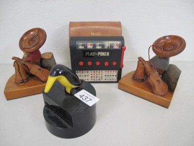 with travel poker machine and pair Mexican me wood bookends 11cms Ht -