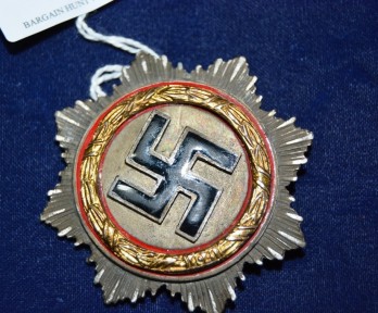 heavy metal, central black out enamel Swastika, pin to rear and stamped maker's details etc, 6cm across -
