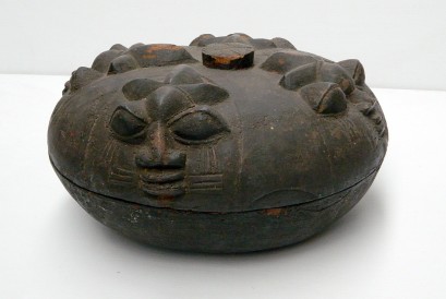 Lid with for recessed face designs with elaborate coiffure. Base is worn and damaged. A/F. Nigeria, Africa.