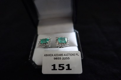 Lot #151 - Pair of emerald 18 ct white gold and diamond earrings