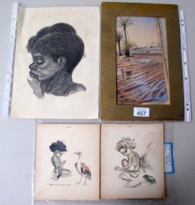 with charcoal drawing J.Curtin & small watercolour Middle Eastern scene (4) -