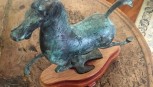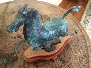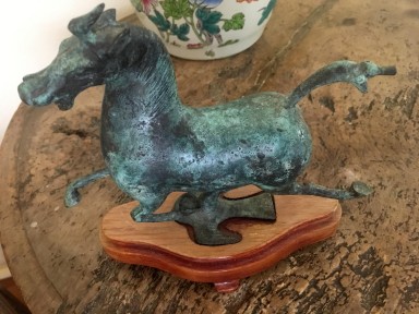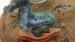 Lot Description:A miniature contemporary sculpture in the Chinese manner of a horse flying, on wooden stand, 20th century