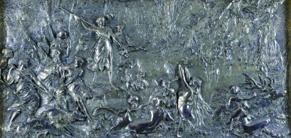 in high relief, depicting Diana the Huntress with her hunting party of maidens with hounds, chasing a stag being protected by naked maidens at the water’s edge, within a forest setting. Unmarked. 550 x 290. Framed. -