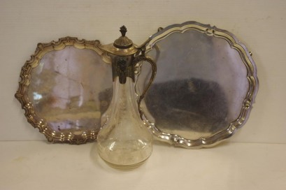 Lot Description:Two silver plated trays & an Edwardian wine ewer