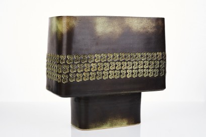 footed vase of rectangular shape, dark grey and green glaze with incised decoration, artist's stamp impressed to underside