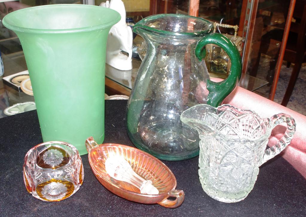 Lot Description:Two vintage glass jugs, green vase