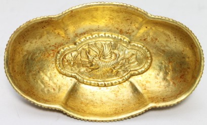 Lot Description:A Lozenge Shaped Gold Metal Dish, a central design of a carp morphing into a dragon, on Low Raised Foot