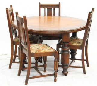 Lot Description:A 1940s Round English Oak Dining Table with a Set of Four Matching Chairs