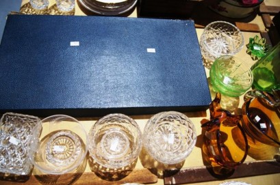 amber glass cut glass items and a boxed cutlery set -