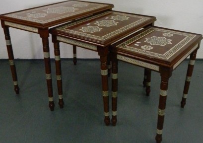 Lot Description:A nest of three Moroccan style mother of pearl inlay side tables