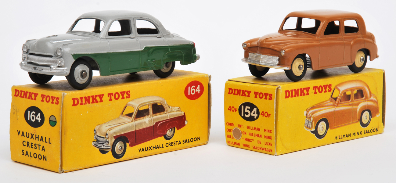 dark tan, grey ridged hubs, 'HILLMAN MINX' cast to underside of roof; and 164 Vauxhall Cresta Saloon, green lower body, grey upper body and ridged hubs, both in illustrated yellow boxes with correct colour spots (VG-E boxes G) (2) -