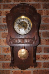 carved oak frame with Dutch inscription 'Time Flies' with image of flowers, angel wings & hour glass, German movement with engraved brass thistle design to centre of dial & corresponding theme to large brass & copper pendulum, 8 d -