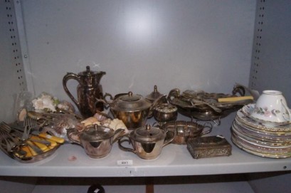 coffee/tea pots, saucers, vintage cutlery, qty of shells -