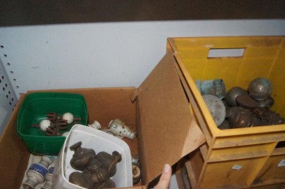 Lot Description:2 boxes: brass & porcelain bed pieces
