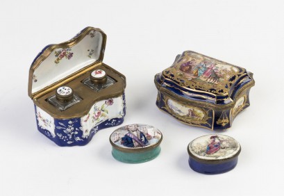 Lot Description:A collection of three enamel objects together with a porcelain hinged jewel box, Continental and English, 18th and 19th century