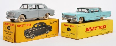 including 521 Peugeot 403 with windows, grey, plated concave hubs, white tyres; and 532 Lincoln Premiere with windows, light blue body, silver roof, plated convex hubs, white tyres, both in illustrated yellow boxes (E boxes G) (2)