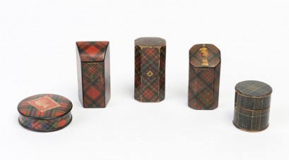 Lot Description:A collection of five Tartanware needle and other containers, Scottish, circa 1808