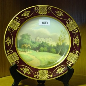 with a landscape scene of a castle, with a gilt & burgundy border, impressed mark to rear NANTGARW -