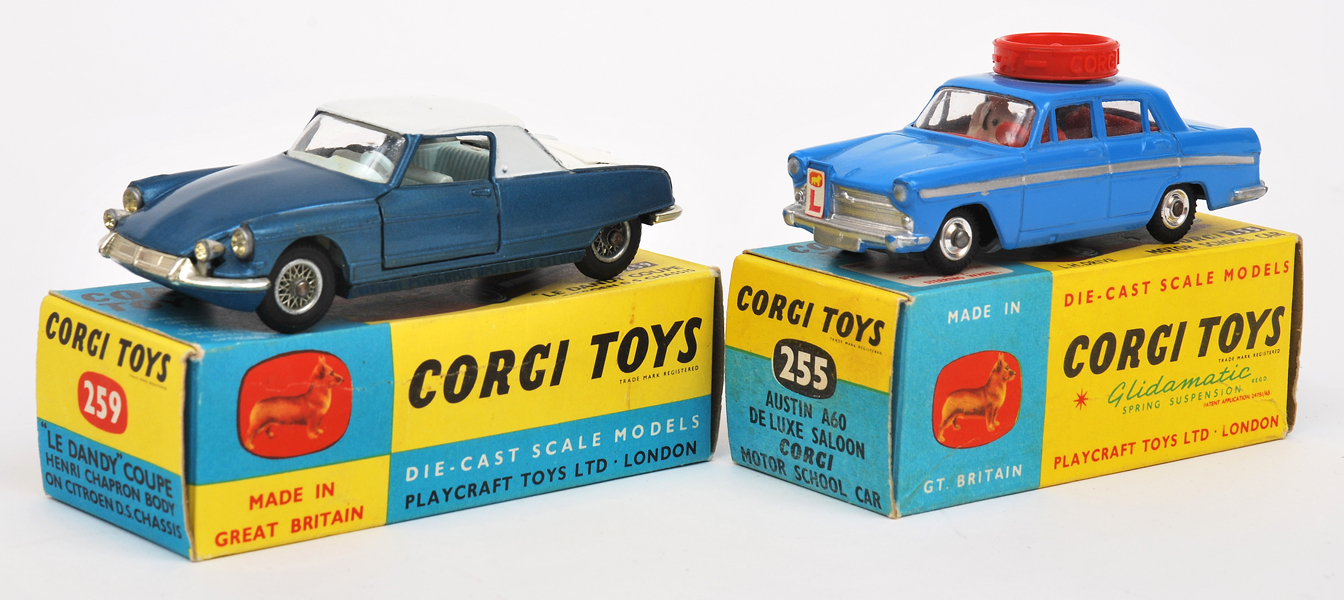 blue body, red interior and roof turning disc, spun hubs, some rubbing to bumpers (G box G); Corgi 259 Citroen Le Dandy, metallic blue, white roof and boot, light blue interior, wire wheels, jewelled headlights, plated parts, some discolouration to interi -