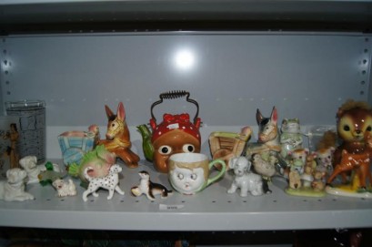 Lot Description:Shelf of retro porcelain incl. Japanese made teapot in the form of a lady with scarf on her head
