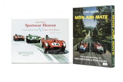 including: “Sports Car Heaven: Aston Martin DB1 vs. Ferrari Testa Rossa - The Battle for the World Championship 1957-1959”, signed inside by Formula 1 driver Roy Salvadori & the author; together with “Mon Ami Mate - The Bright Brief Lives of Mike Hawthorn & Peter Collins” limited edition (11/100) signed copy, with accompanying page signed by Peter Collins & Mike Hawthorn. -