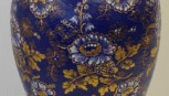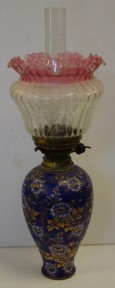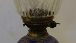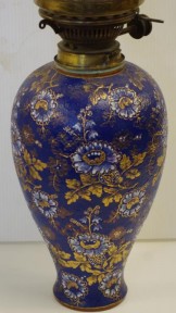 Slater's patent stoneware font with a royal blue background and gilt and white enameling, Hinks No. 2 Duplex burner, lamp base ex Theodore Bruce, 57cm high -