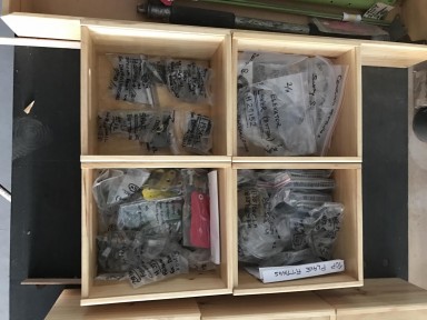 Box 1: bottom plane rear spar plate and port, spar lugs, port aileron; Box 2: rudder bracket steering, cowling fittings, C brackets, sundry spares, cowl clips, elevator lever, tail fin attachment and other parts. -