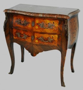 2 drawers, with rouge marble top, floral marquetry to front and sides, gilt brass mounts.