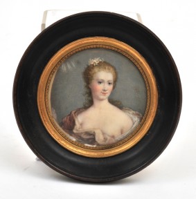 INITIALLED CH. AND DATED 1860 Depicting a young woman swathed in cloth and wearing flowers in her hair, set within a circular gilt and ebonised frame, 11cm diameter. -