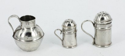 comprising a handled domed pepper shaker, S.B., Birmingham 1897, a domed salt shaker M.B., Birmingham, 1900 and a round bellowed jug, JC & Co Ltd, Birmingham 1909. Total weight 20g. -