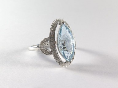 end-set aquamarine within a border of diamonds in 18ct white gold. Size N. -