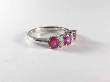 three oval rubies claw-set and spaced by four brilliant-cut diamonds; 18ct white gold. Estimated weight of rubies 3 = 1.52ct. Size N. -