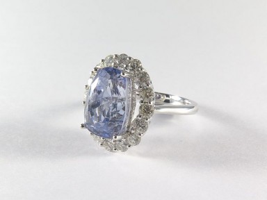 a native-cut Ceylon sapphire within a border of sixteen diamonds in 18ct white gold. Estimated weights: Sapphire = 8.75ct, Diamonds 16 = 1.00ct. Size N+. -
