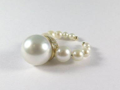 14mm cultured pearl with domed diamond-set cap and smaller salt-water Akoya pearls on a flexible shank. (size adjustable) -