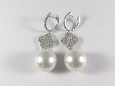 each a 13.5mm South Sea cultured pearl suspended from a quatrefoil diamond-set motif and a diamond-set loop; 18ct white gold. -