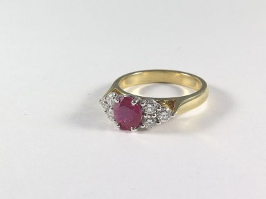 an oval Burmese ruby with six shoulder diamonds in 18ct gold. Estimated weights: Ruby = 1.05ct, Diamonds 6 = 0.50ct. Size N. -