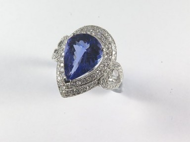 drop-shape tanzanite claw and end-set in a double border of brilliant-cut diamonds and with diamond-set heart-shape shoulders; 18ct white gold. Estimated weights: Tanzanite = 3.40ct, Diamonds estimated total weight 0.50ct. Size P. -