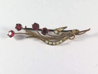 set with red pastes and paste pearls (one real); metal pin; Thompson & Graham (Melbourne) Width 48mm. -
