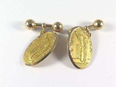 double-sided oval links each relief-decorated with a batsman taking guard; chain and dumb-bell connections; Apex - Rodd (Sydney). Total wt 5.2g. -
