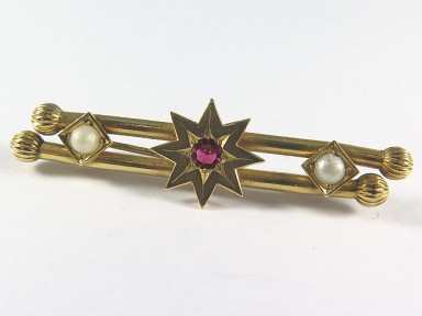 with a star motif set with a red stone flanked by paste pearls on an off-set two-bar with reeded sphere terminals; Macrow & Sons (Melbourne) Width 52mm. Wt 5.2g, -